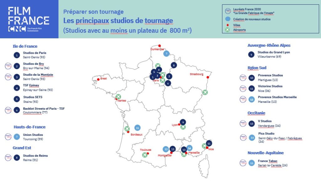 Depuis 2020, la France a lancé différents plans d’investissement pour soutenir la croissance et la création de studios. De Paris à la côte méditerranéenne, une nouvelle génération de studios voit le jour, équipés des dernières technologies en matière de production virtuelle, de plateaux de tournage et de technologies durables, prêts à répondre aux exigences des productions les plus ambitieuses d’aujourd’hui, grâce au plan d’investissement France 2030 – La Grande Fabrique de l’Image.